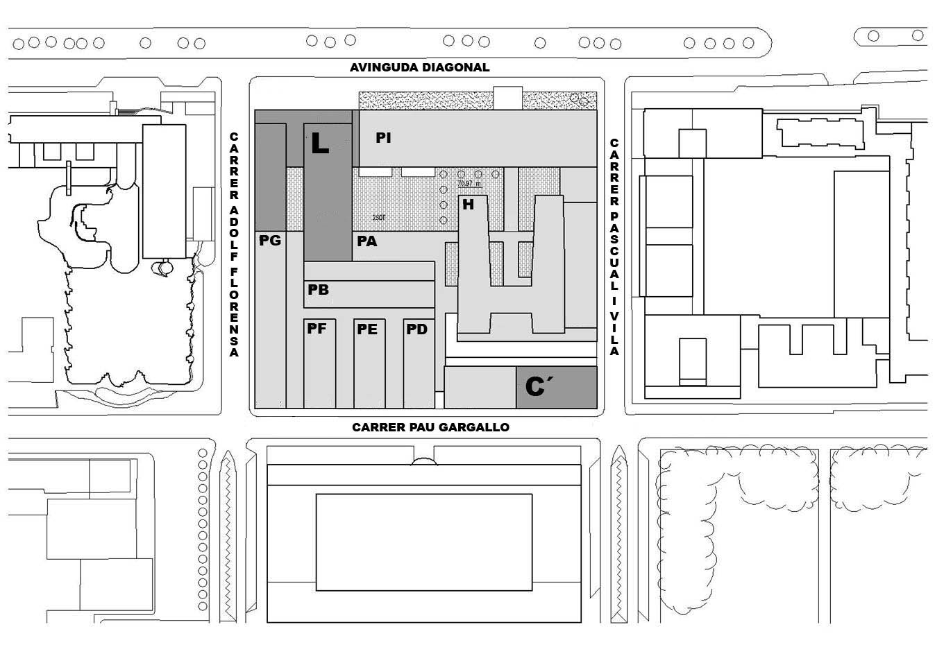 El primer conjunt edificatori (L) es construirà a la cantonada de l’avinguda Diagonal amb el carrer d’Adolf Florensa, i ocuparà la zona que actualment es destina a l’aparcament de l’Escola. El projecte, realitzat per l’arquitecte Josep Lluís Mateo i l’enginyeria IDOM, planteja, per una banda, l’allargament dels pavellons I i G fins a la cantonada esmentada, amb igual fondària i alçària. I per l’altra, la construcció d’un nou edifici de volumetria similar al de l’Escola Tècnica Superior d’Arquitectura de Barcelona, ETSAB, anomenat Segarra i que es troba a l’illa veïna.